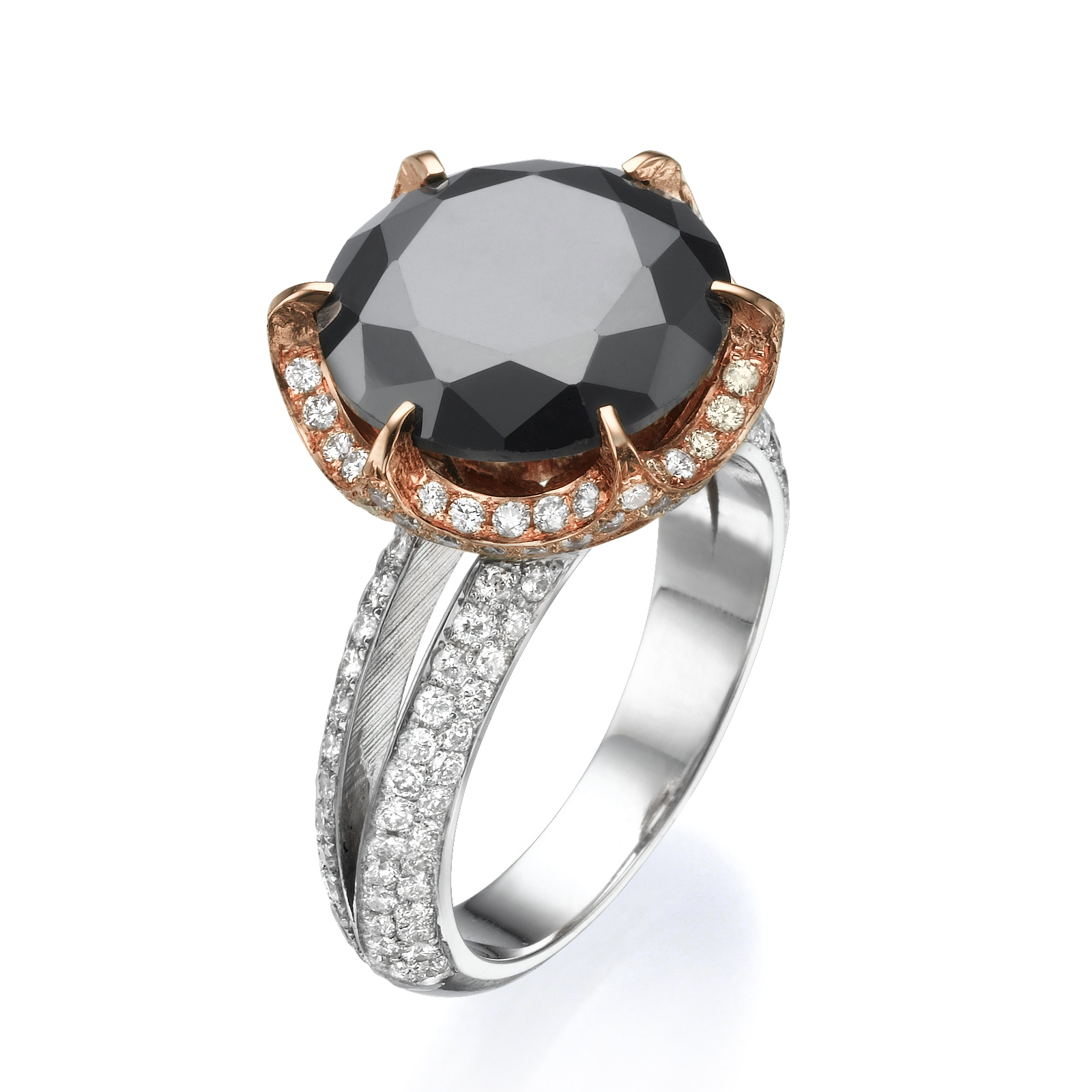 טבעת מעוצבת ומיוחדת -משובצת ביהלום שחור במרכז ומסביב יהלומים שקופים