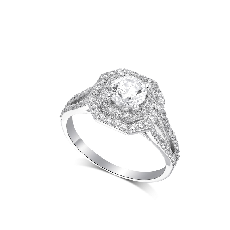 טבעת יהלומים מעוצבת ומשובצת ביהלומם מרכזי גדול ומסביב יהלומים בצורת קושן